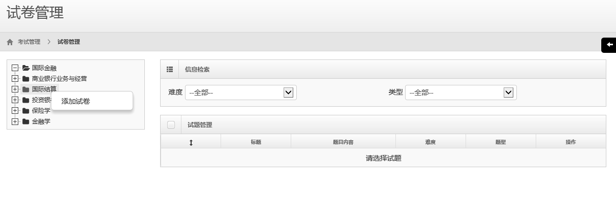 采用歷年銀行從業(yè)資格考試題目及書本或其它來源的題目為總題庫(kù)。主要功能有練習(xí)中心和考試中心。練習(xí)中心由老師設(shè)置題目,在題庫(kù)中選取,可手動(dòng)選題和隨機(jī)選題,主要用于學(xué)生平時(shí)練習(xí)。學(xué)生做完可以查看正確情況??荚囍行南扔衫蠋熢O(shè)置試卷,可設(shè)置考試時(shí)間、有效期、分?jǐn)?shù)、題目等等,也可隨機(jī)生成考卷。學(xué)生選擇考卷后開始答題,試卷題目順序隨機(jī)打亂,答題計(jì)時(shí)器在規(guī)定時(shí)間結(jié)束后自動(dòng)提交試卷。完成考試學(xué)生可查看得分情況及正確答案。軟件界面美觀、操作簡(jiǎn)便、實(shí)用有效、可以升級(jí)。