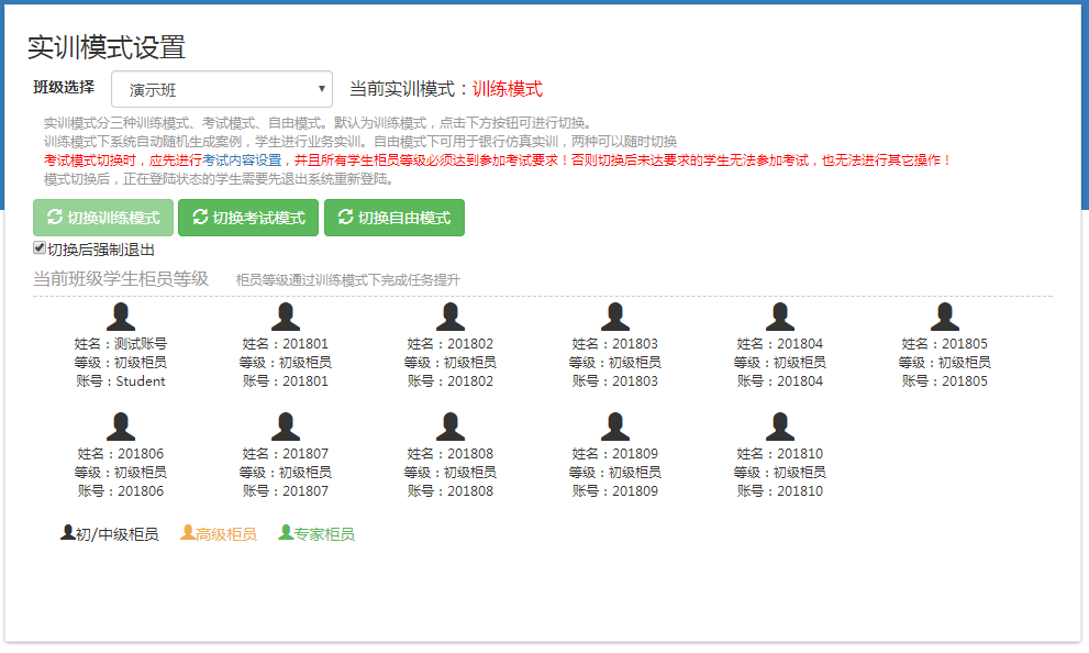對(duì)注冊(cè)到自己班級(jí)下的學(xué)生進(jìn)行維護(hù)及管理,對(duì)班級(jí)進(jìn)行管理,對(duì)班級(jí)學(xué)生模擬環(huán)境的初始值進(jìn)行設(shè)置,對(duì)學(xué)生進(jìn)行角色輪換及評(píng)分操作,同時(shí)可與學(xué)生進(jìn)行在線交流,可通過公告牌發(fā)送通知,可對(duì)自己的資料進(jìn)行修改。