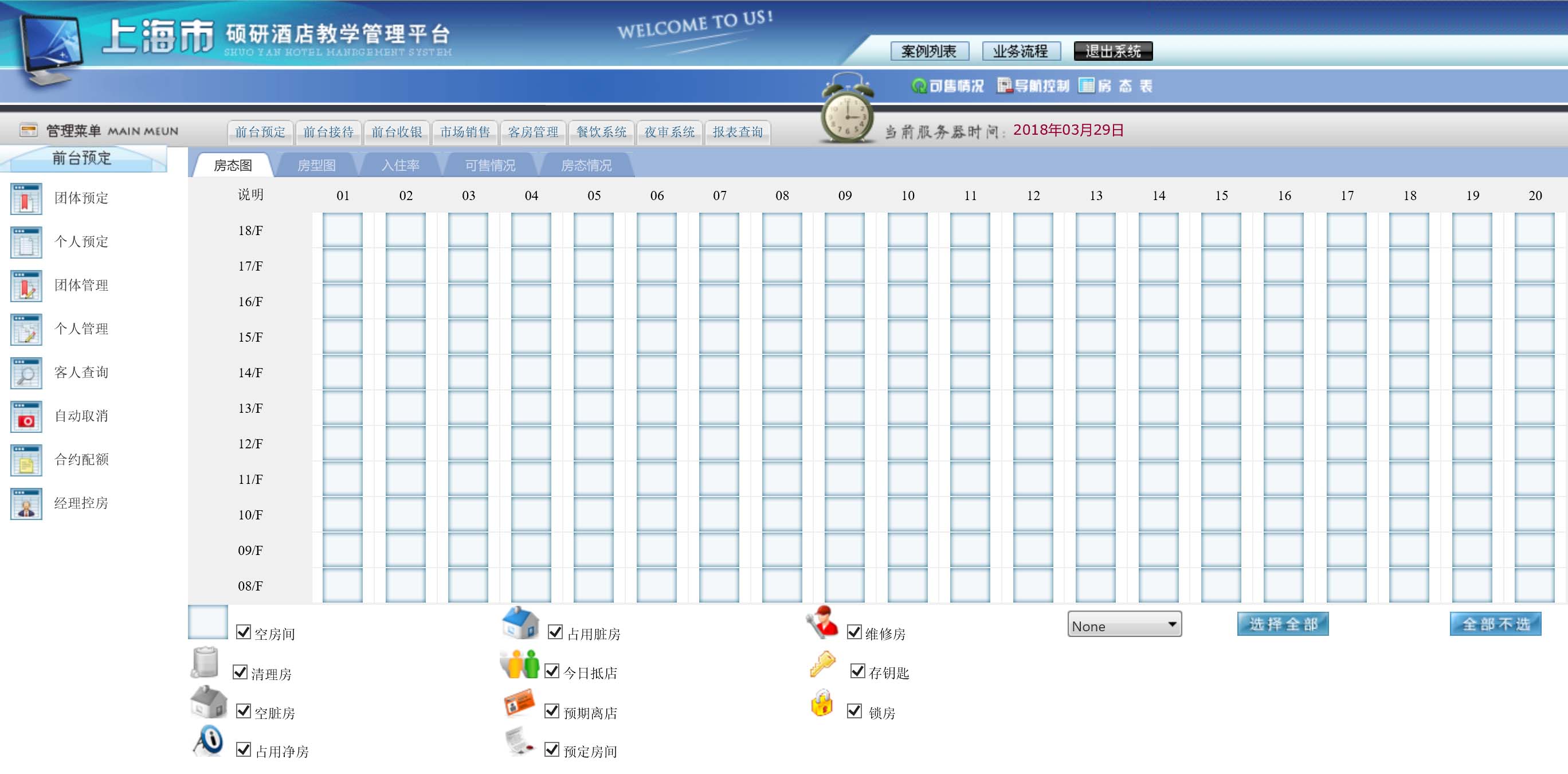 酒店前臺(tái)管理日益成為酒店業(yè)務(wù)的重中之重。鑒于此我們針對(duì)酒店前臺(tái)業(yè)務(wù)集中研發(fā)。碩研酒店管理前臺(tái)管理系統(tǒng)主要包含前臺(tái)預(yù)定,前臺(tái)接待,前臺(tái)收銀,市場(chǎng)銷售,客房管理,夜審系統(tǒng),報(bào)表查詢等功能。